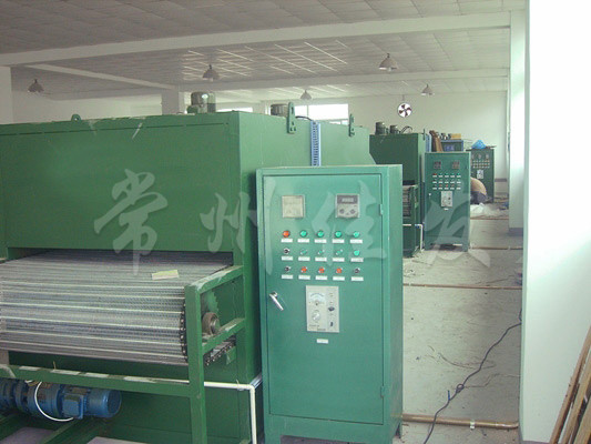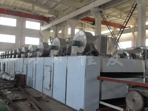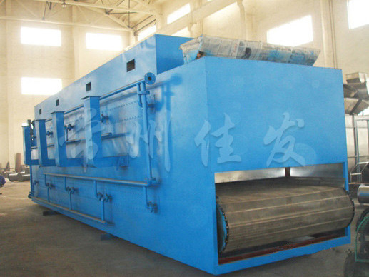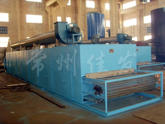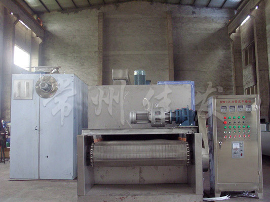 物料由加料器均勻地鋪在網(wǎng)帶上,網(wǎng)帶一般采用12-60目不銹鋼絲網(wǎng),由傳動裝置拖動在干燥機內(nèi)移動。干燥機由若干單元組成,每一單元熱風(fēng)獨立循環(huán),部分尾氣由專門濕風(fēng)機排出,廢氣由調(diào)節(jié)閥控制,熱氣由下往上或由上往下穿過鋪滿物料的網(wǎng)帶完成熱量與質(zhì)量傳遞的進(jìn)程,帶走物料的水份。網(wǎng)帶緩慢移動,運行速度可根據(jù)物料溫度自動調(diào)節(jié),干燥后的成品連續(xù)落入收料器中。上下循環(huán)單元根據(jù)用戶需要可靈活配備,單元數(shù)量亦可根據(jù)需要選取。